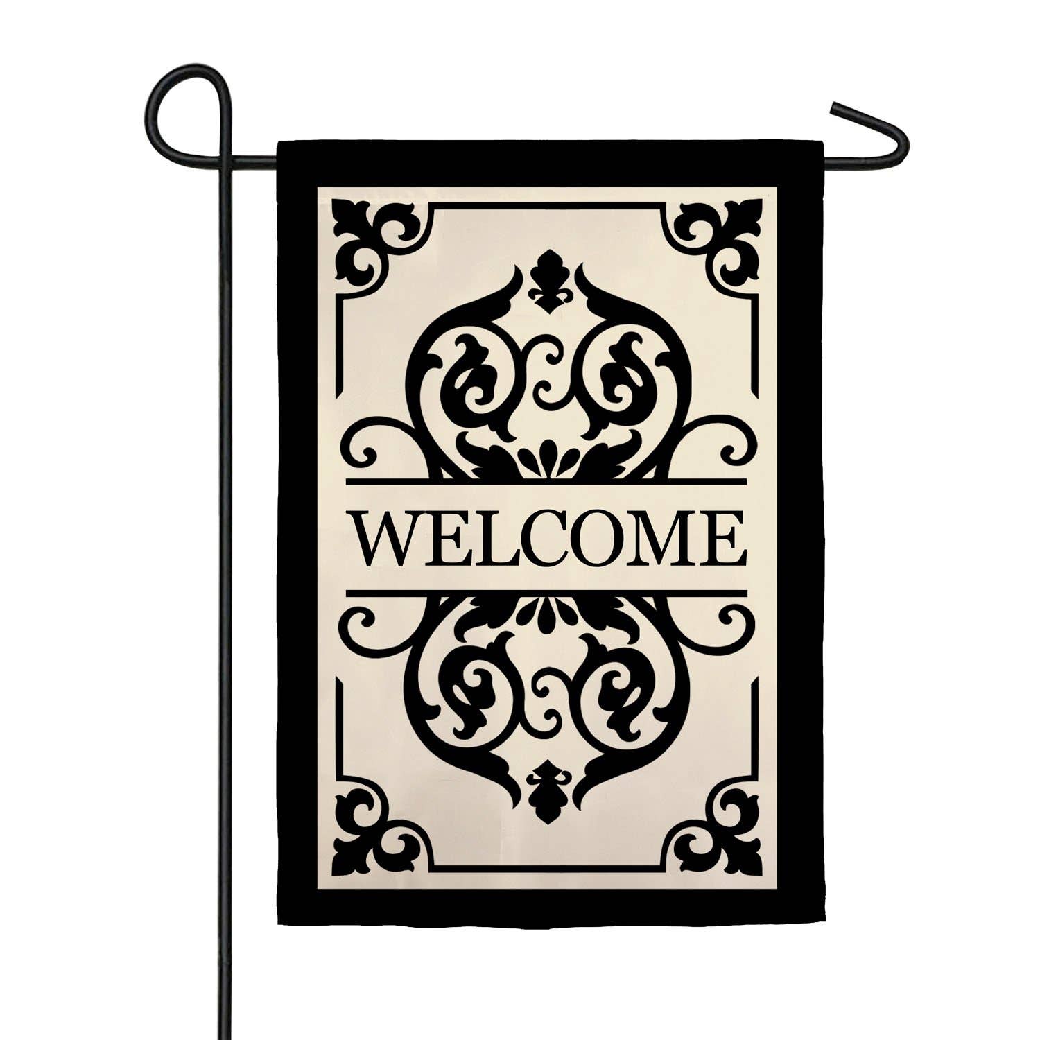 This garden sized applique flag features a beige background with a fleur de lis border and a black damask interior that frames the word "Welcome". Hardware sold separately.