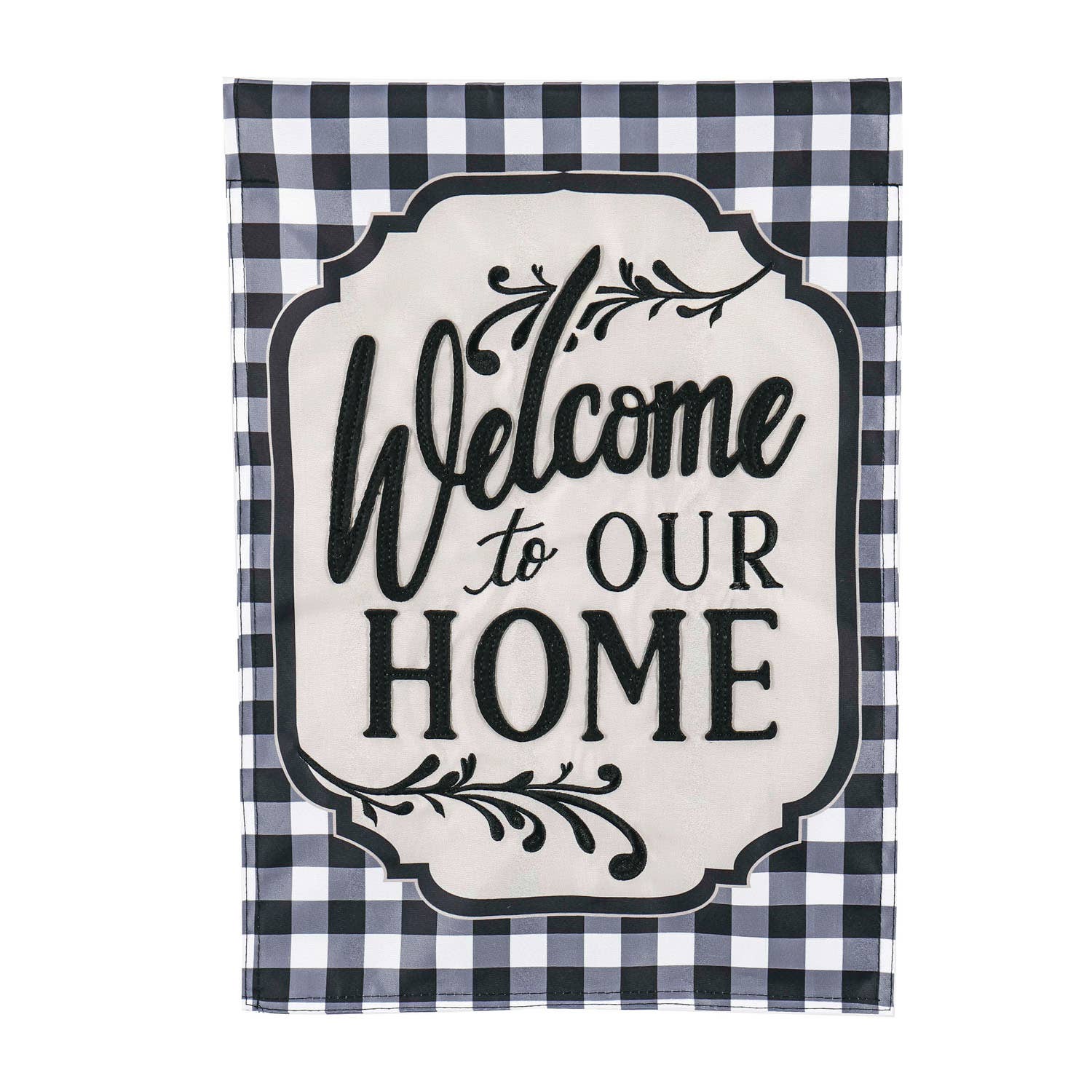 A black and white checkered pattern surrounds a "Welcome to our Home" message in this Classic Welcome Home House Applique Flag.