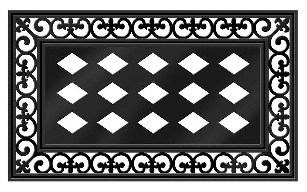 This mat tray features a diamond background pattern where the Sassafras insert fits perfectly. The rubber border features a fleur-de-lis scroll pattern. This seasonal, switchable mat features a 10 x 22 inch space for Evergreen's decorative switch mats. This mat frame is made of recycled rubber and is mildew resistant, featuring a skid-resistant backing to help keep the mat in place. This mat measures approximately 18 x 30 inches and is safe for indoor or outdoor use. For stains, simply spot clean with soap and warm water.