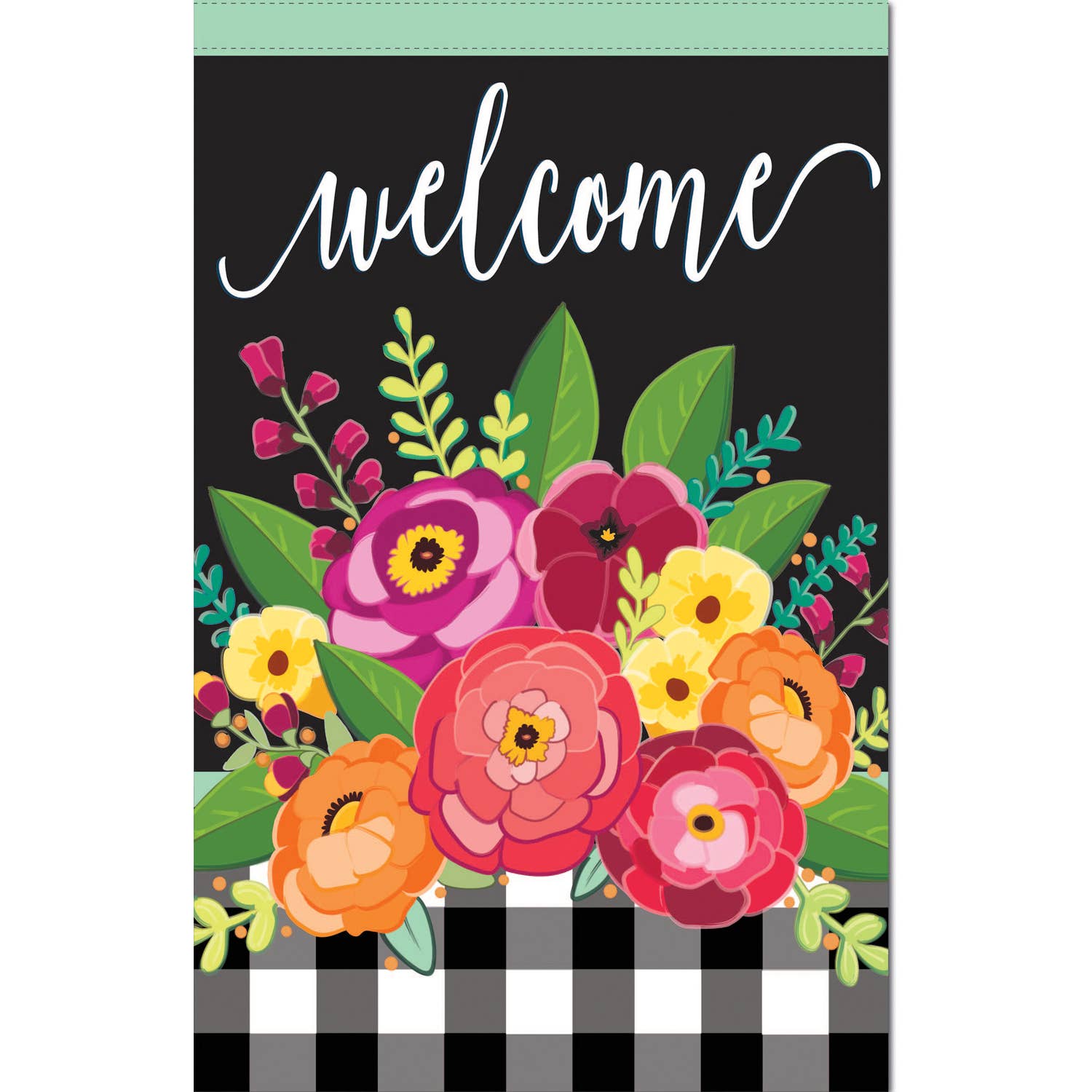 Striking details allow this house flag design to come to life while greeting guests in undeniable style. With its welcoming message, this flag features a vibrant bouquet of flowers against a buffalo check accent that is sure to turn heads in any garden or home. Made of lightweight, durable linen material, this lively flag is designed to withstand a variety of weather conditions. Our flag creation process involves combining pieces of fade-resistant fabric with tight, detailed stitching in order to create a dimensional effect. Printed ink colors are protected with a watertight seal, so customers can enjoy their flag for years to come.