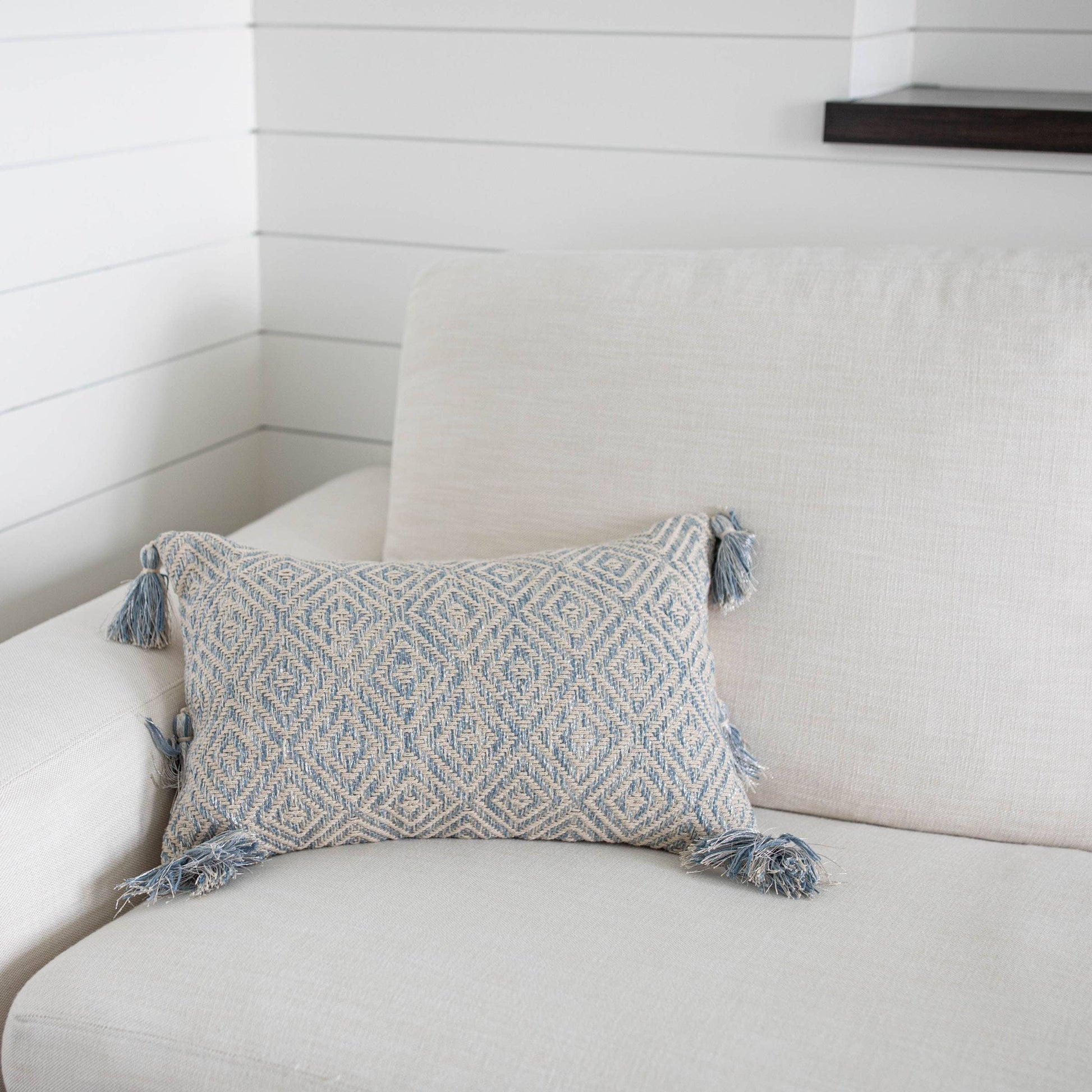 Lounge in comfort and in style with this chic throw pillow from Foreside Home & Garden. The flat woven diamond pattern and silver lurex yarns add metallic shine and give off a modern boho vibe. The tassel adorned edges bring a fun and stylish look, allowing it to fit effortlessly into any space. Blue and plain cotton yarns are hand woven by artisans in India.