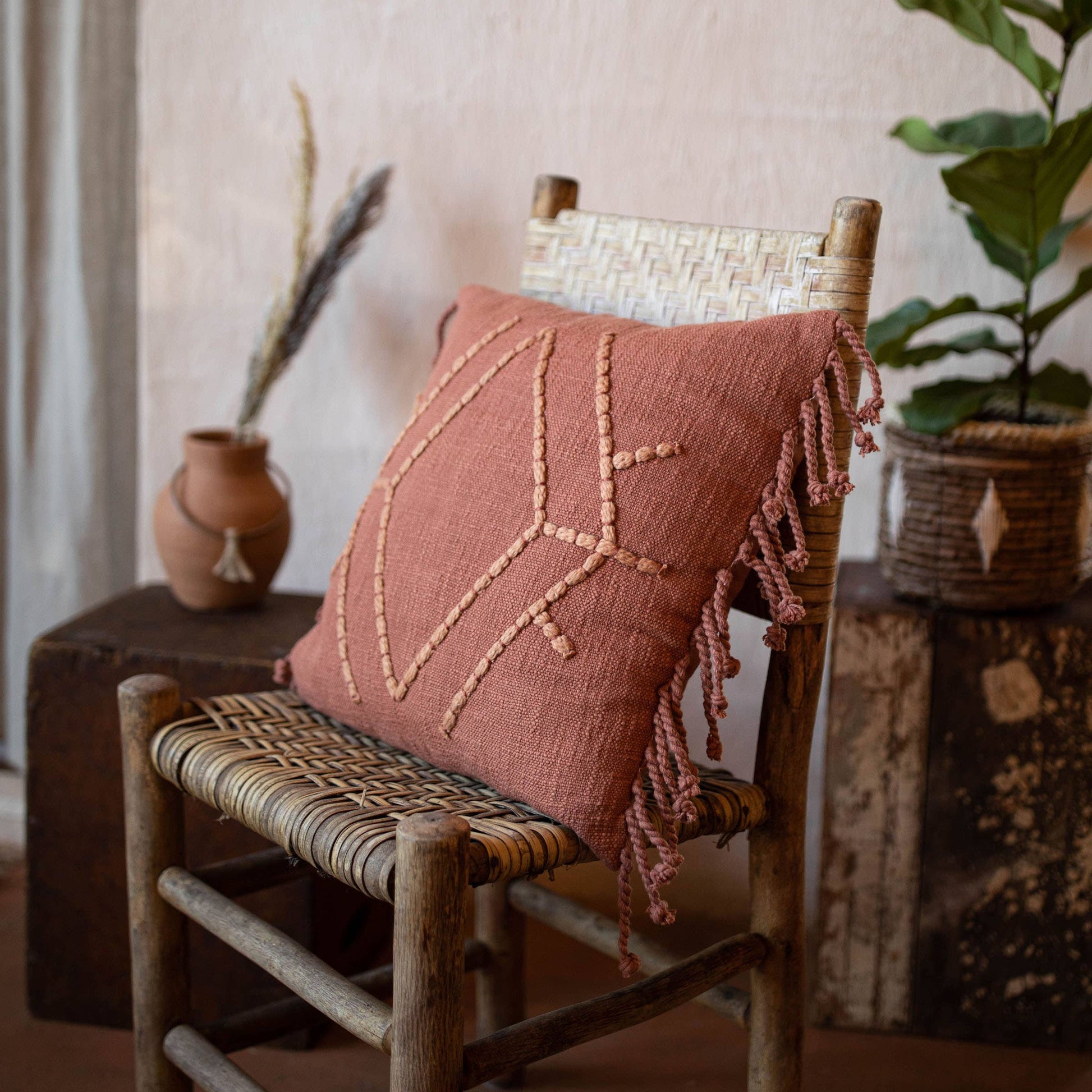 Finding inspiration in earthy, boho vibes, this throw pillow offers a rustic-meets-boho look. Rust-orange terracotta-colored yarns are paired with a dori embroidered design and a soft slub base. Braided tassels flanking the ends of the pillow help keep things casual. Hand woven by artisans in India.