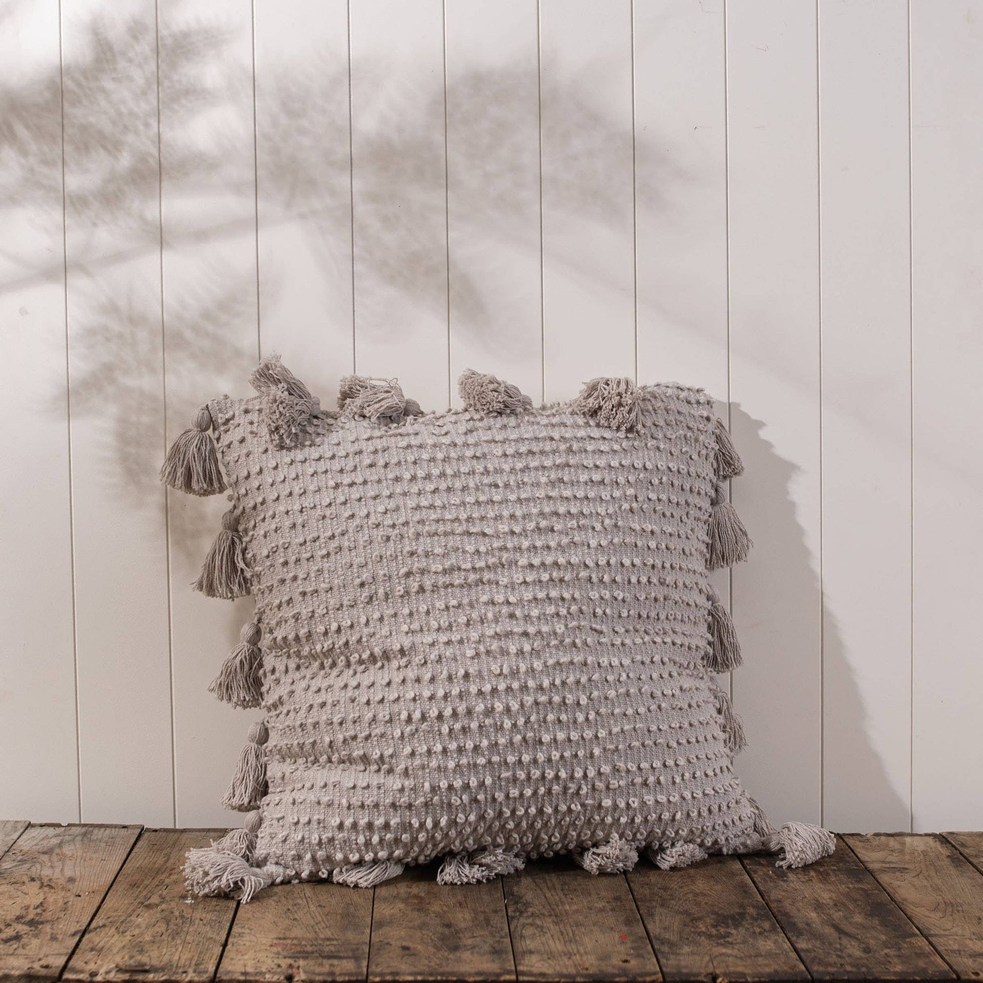 Elegantly soft and cozy, this large, oversized pillow from Foreside Home & Garden is a textural addition to your pillow selection. The gray solid color is given interest with small boucle knots and oversized tassels at each of the edges. This soft and subtle throw pillow is hand-woven by artisans in India.