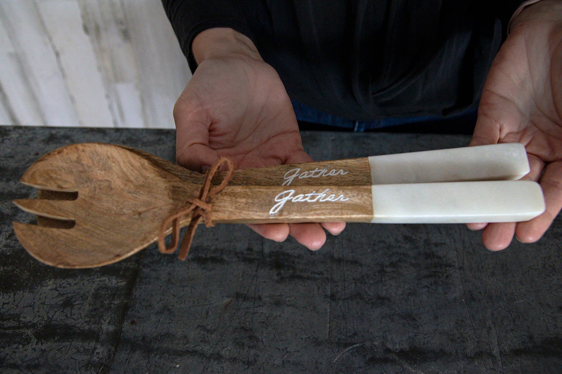 The kitchen is often a place in which we gather. Inspired by that sentiment comes this set of serving utensils perfect for all your serving needs. Solid white marble stone handles fuse with natural mango wood engraved with "gather" in white lettering on each utensil. The neutral coloration allows these utensils to fit seamlessly with your other traditional kitchen, while the quality craftsmanship with which each piece is made adds a unique and special element.