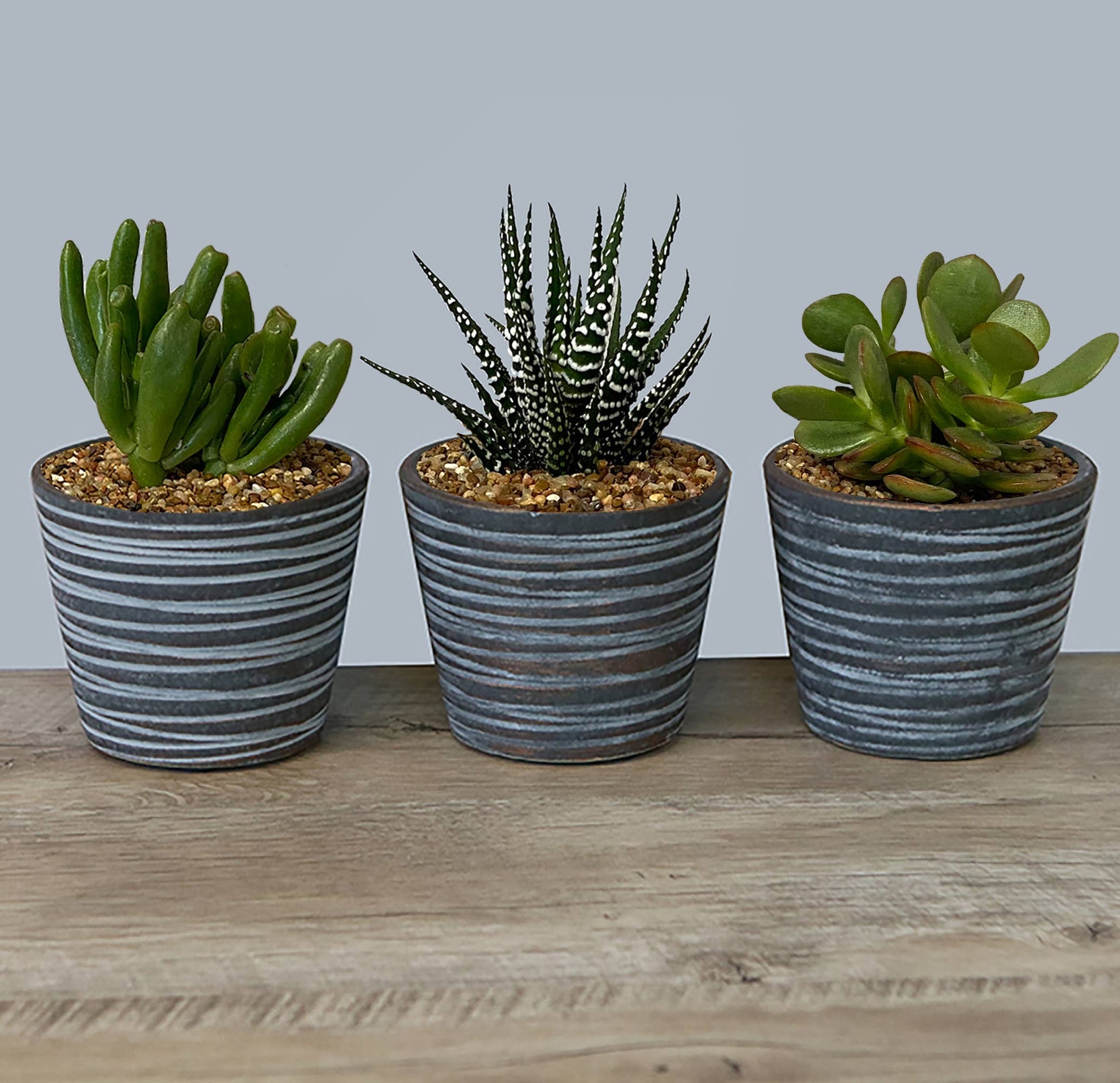 Included in Purchase: (3) 4" indoor ceramic succulent plant pots. Available in a variety of colors that fit beautifully with all succulent plants. Minimum order quantity is 1 pack of 3 per color (3 total pots per color). You have the option to include wood stands for each pot. All pots include footpads to avoid scratching/rubbing the surface its placed upon. Does not include plants. Exact pot dimensions: 3.74"W x 3.15"H,