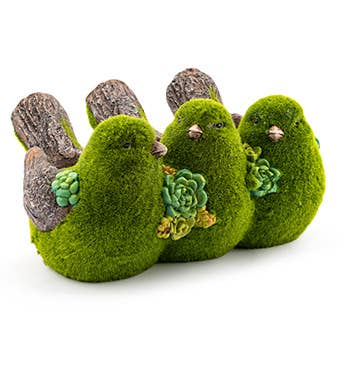 Are you looking for a Unique Planter? This Mossy Triple Bird planter with it's color and texture is that. Made of Resin