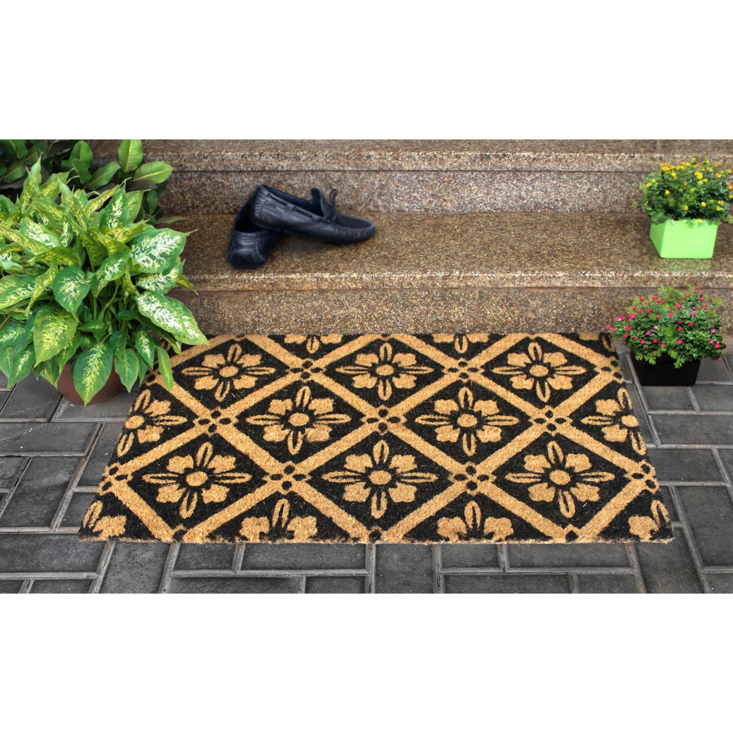 Make your home more inviting with our printed contemporary doormat. Crafted of coir, a fiber made from the husk of a coconut, this textural piece will keep the outdoors out and the indoors a little cleaner. Coir face with vinyl non-skid back. To clean simply sweep or shake. Made in India.